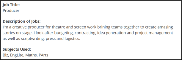 Benchmark 4: Linking curriculum learning to careers | Subject departments and all teachers expected to link classroom learning with careers Show relevance of subjects to workplace & employability. | Use the ‘Subjects’ search filter to discover volunteers by the subjects they use in their job. This is especially useful to find less obvious links between subjects and jobs. For example, a theatre producer who uses maths. |